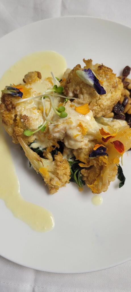 The menu we sampled included nama-topped crudo, smoked chicken with watermelon cubes, a cumquat cheesecake that was the perfect combination of sweet and sour. And the dish of the day? Roasted cauliflower dusted with edible flowers and micro- greens from Taveuni, accompanied by pinenuts and raisins and a delicious garlic cream sauce.