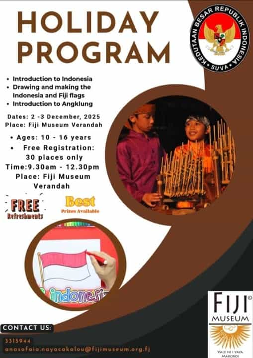 Event Date: 2 Dec 2025Don’t miss out on the incredible School Holiday Program proudly funded by the Embassy of the Republic of Indonesia in Fiji. Due to overwhelming interest, spaces are strictly limited. Make sure you secure your spot as soon as possible. What to Expect: Learn the Angklung. Come and immerse yourself in a unique cultural experience by […]