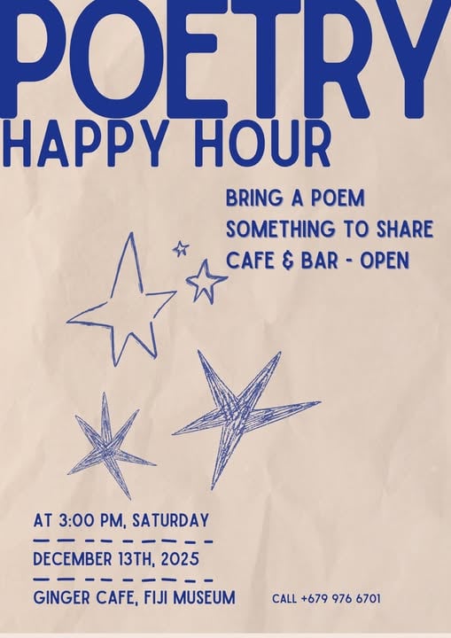 Event Date: 13 Dec 2025Still riding the high from last week’s poetry slam, we’re gathering one more time before the year ends. Join us on Saturday, December 13th, for Poetry Happy Hour, our final poetry gathering for the year at Ginger Kitchen, Fiji Museum from 3pm. Bring a poem, bring something to share, or just bring yourself the café […]
