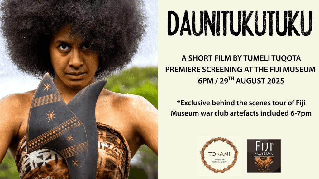 Event Date: 29 Aug 2025Join us for the Fiji Premiere of the latest short film by Tumeli Tuqota about the Fiji of Old. The event will an include an exclusive behind the scenes tour of the Fiji Museum’s artefacts that are used and referenced in the film from 6-7pm before the screening. It will be followed by a panel […]