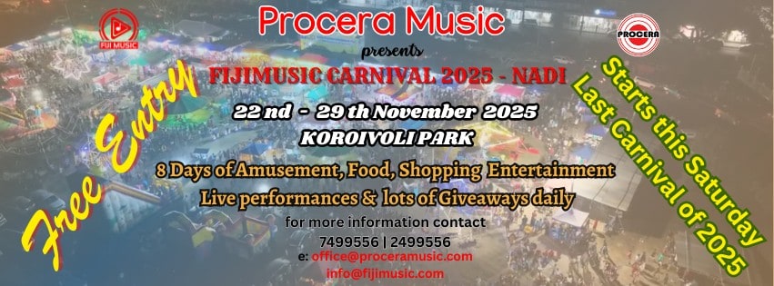 Event Date: 22 Nov 2025Saturday 22nd to 29th November Koroivoli Park, Nadi. The biggest week of music, culture, dance and pure island vibes is taking over Nadi and we’re bringing an UNMATCHED lineup this year! Featuring: Savu Ni Delai Lomai Pro Jam Band Kira Dance Group Cakaulekaleka Group Black Pink Buadomoni Group Voqa Kei Valenisau Ocean Island Group Sunny […]