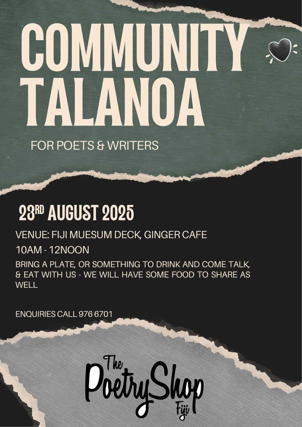 Event Date: 23 Aug 2025Fresh off the hype from last month’s Poetry Slam, we invite all poets & writers to our next Community Talanoa! Come hang out, share ideas, and enjoy some food with fellow creatives. Bring a plate, or something to drink, and join the conversation. 23rd August 2025Fiji Museum Deck, Ginger Cafe10AM – 12NOON We’ll have some […]