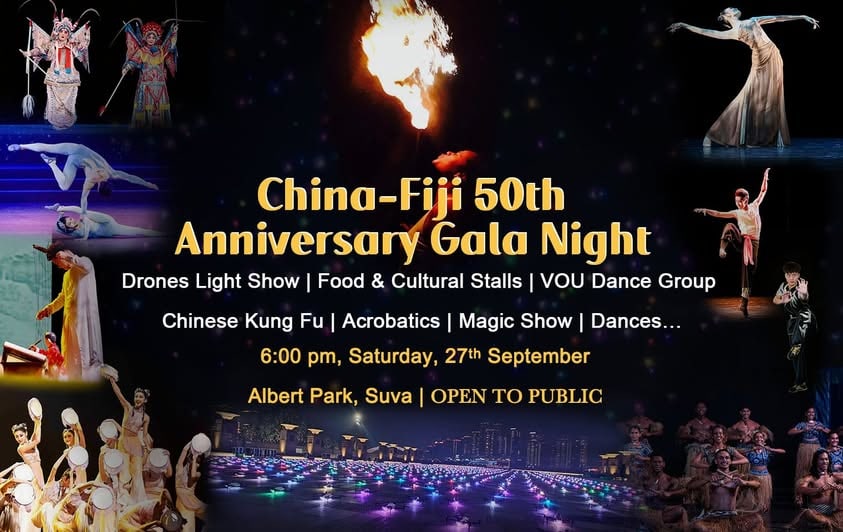 Join the grand celebration of 50 years of China-Fiji diplomatic relations! The first-ever drone light show, stalls and giveaways, VOU dances, Chinese Kung Fu, and many more! See you this Saturday, 27th September, at Albert Park!
