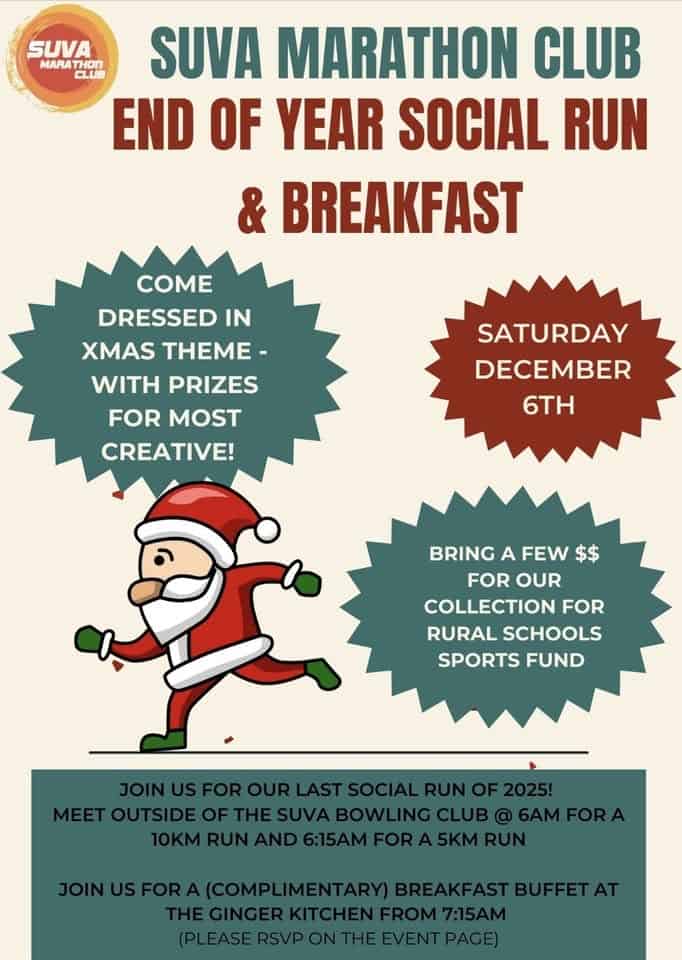 Hey Suva! Come and celebrate a fabulous year running with us this Saturday the 6th of December. We’ll be having our last 2025 Suva Marathon Club Social Run with a Christmas twist. Come dressed as an elf or throw a bit of tinsel in your hair – do your best to dress Christmasy. There’ll be a bunch of prizes for those looking the part!
