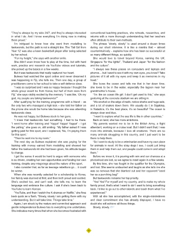 practitioners came to her school to take a self-defence class. She loves the ocean and tells me that in her down time,